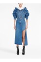 Elevate your denim collection with this slashed denim midi skirt from Alexander McQueen. Crafted from stonewashed blue cotton, this skirt features unique cut-out detailing, a front button and zip fastening, and classic five pockets. Designed to fit true to size. Model is 1.75m / 5ft 8in and is wearing size 40 (IT).