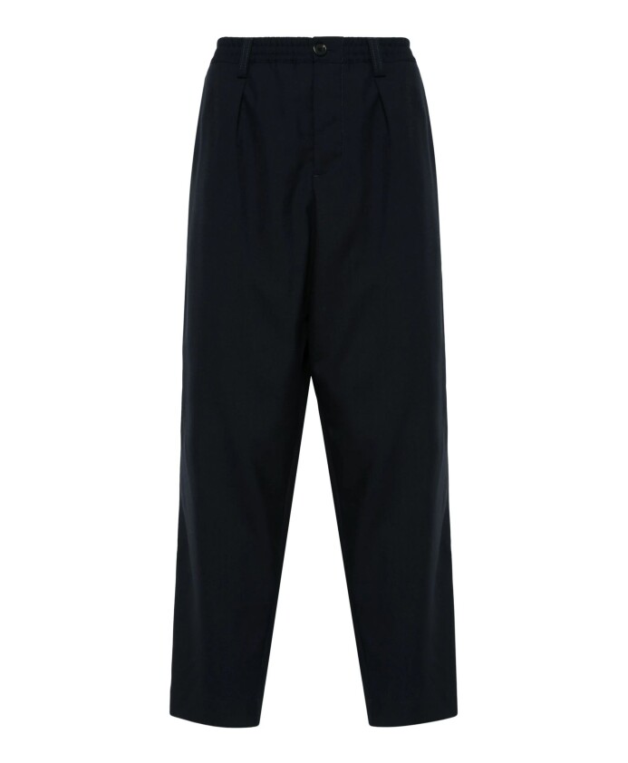 Marni`s Blue Wool Twill Trousers offer a sophisticated look with their elastic waistband and tapered leg, perfect for both casual and formal settings. Key attributes: Blue | Virgin Wool Twill | Elastic waistband with internal drawstring | Belt loops | Two slit side pockets | Two back welt pockets | Pleated details | Tapered leg | Button closure | Dimensions & fit: True to size fit | Composition & care: Virgin Wool | Dry clean only