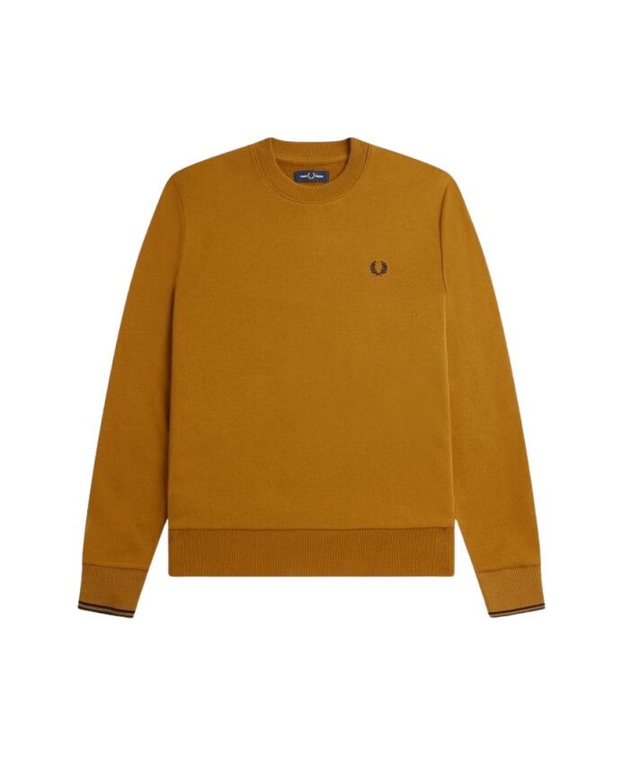 Upgrade your casual wardrobe with this men's long-sleeve Fred Perry sweatshirt. Crafted from 100% cotton fabric, it features contrasting stripes on the sleeves, a round neck, a contrasting logo on the chest, ribbed cuffs, collar, and hem, all in a Caramel hue.